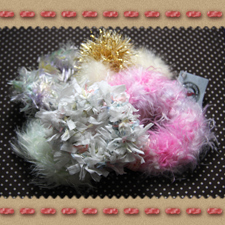 モフモフの糸を独自の手法で編んだシュシュと、ビーズを使ったアクセサリー
